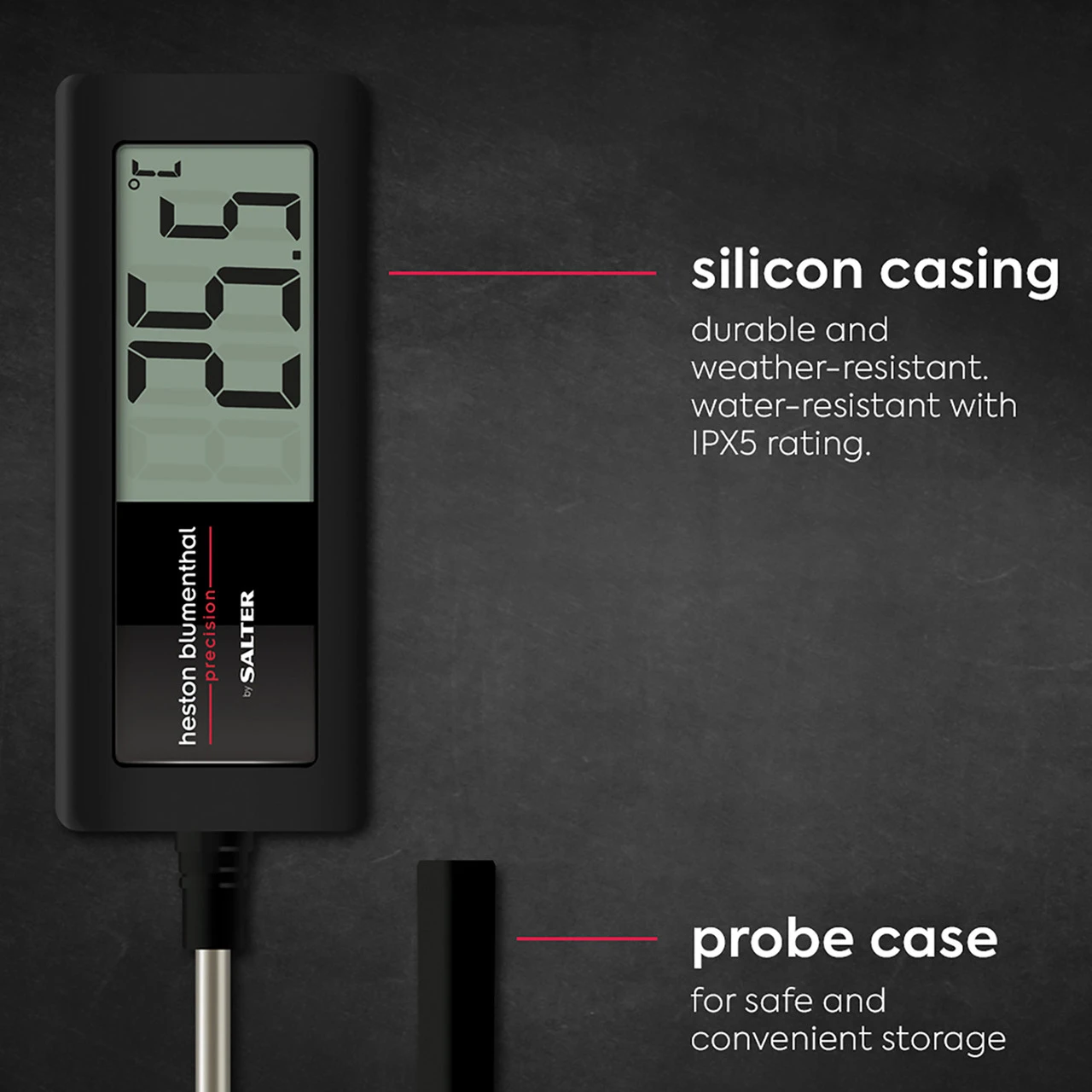Enhance your cooking ability with the Indoor & Outdoor Meat Thermometer from Heston Blumenthal Precision by Salter. Perfect for jam making, checking meat temperatures, confectionary, BBQs and more. Including a probe case for safe and convenient storage, the thermometer is durable and water-resistant (IPX5 rated) with ultimate precision. Measure temperatures quickly to 0.1°C accuracy on the large display. The extra-long 180 mm probe with 1 cm guide markings is perfect for any kitchen connoisseur.