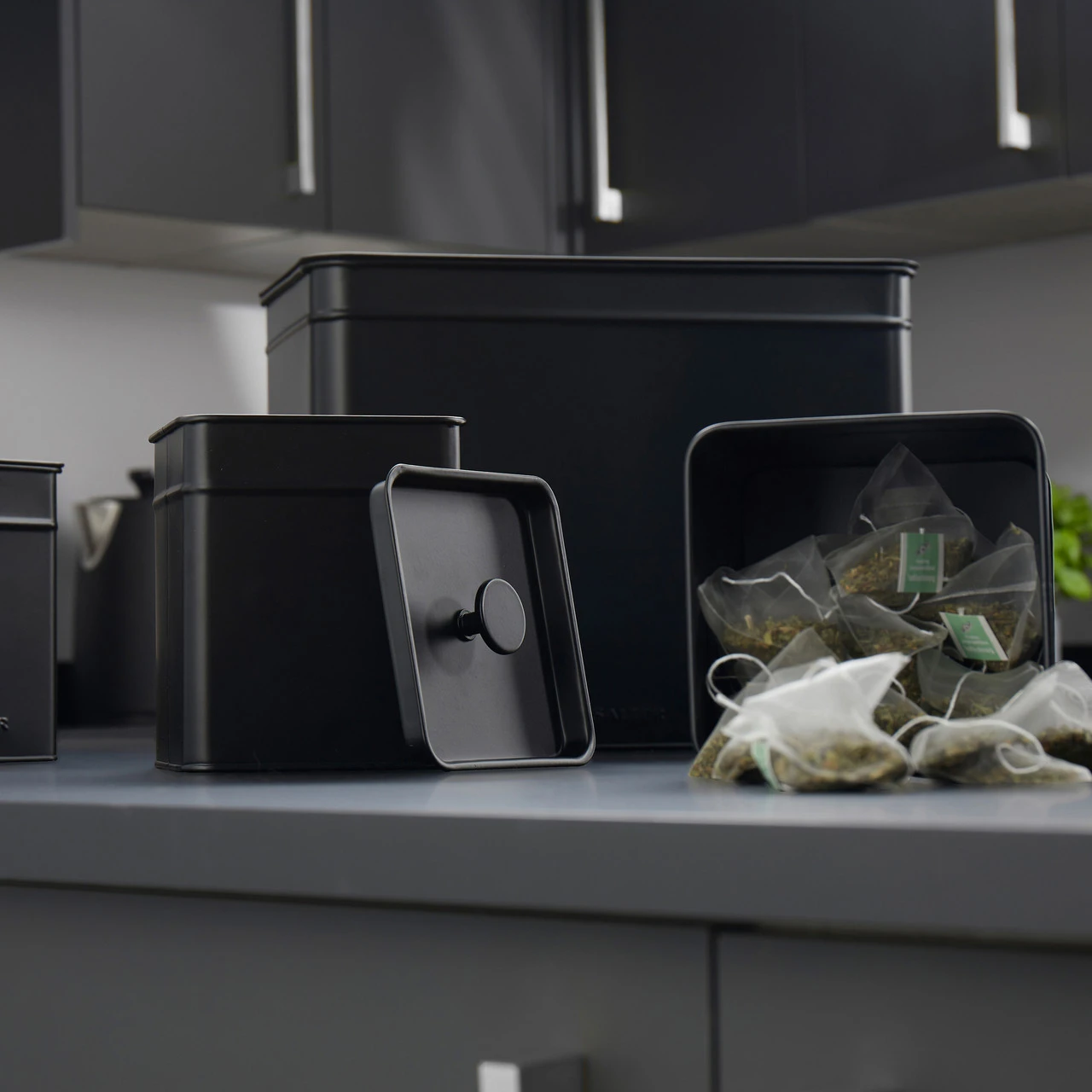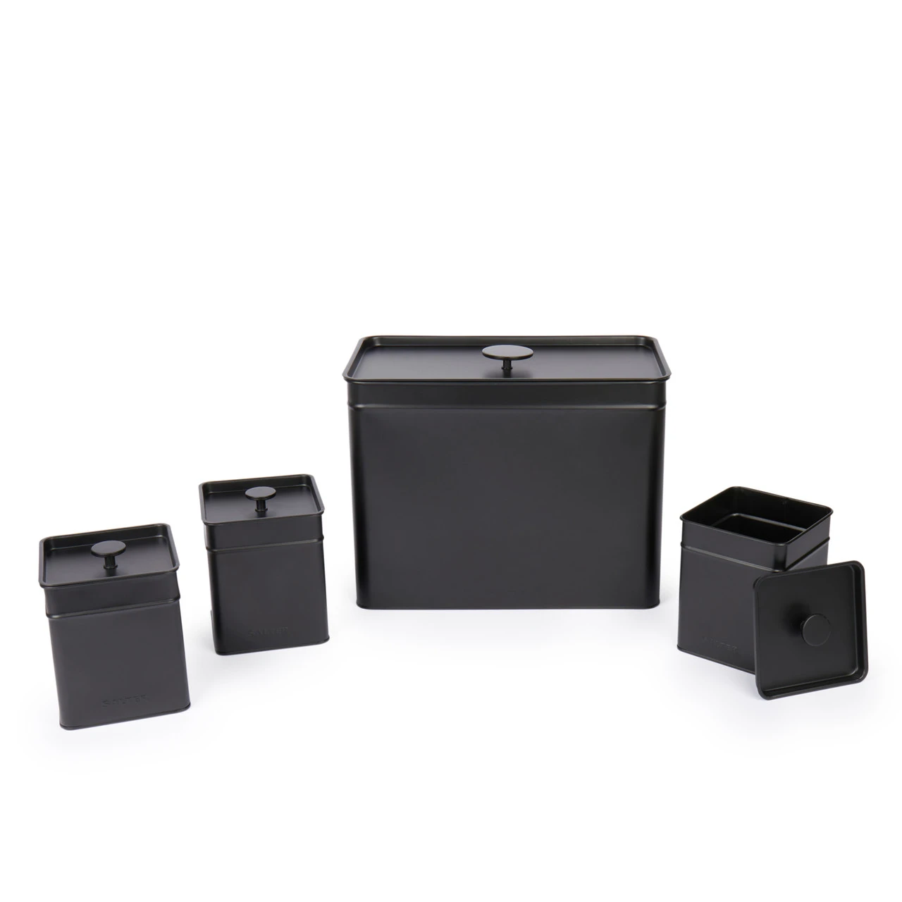 Enhance your modern kitchen with the Salter Kuro 4-piece countertop set. This set includes 1 bread bin and 3 smaller containers that are perfect for storing tea, coffee, sugar, or other dry goods. The sleek black powder-coated finish, which is easy to clean, gives a stylish edge to the design. The modern square design not only looks great on the countertop but will also help to keep your kitchen organised. The carbon steel containers are ideal for keeping for food fresher for longer.