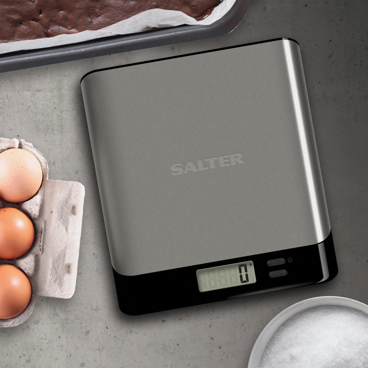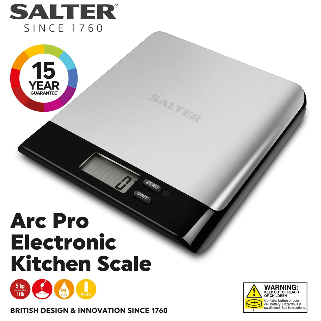 - Compact yet accurate, the Arc Pro Stainless Steel kitchen Scale from Salter is a kitchen essential, making cooking and baking easy.