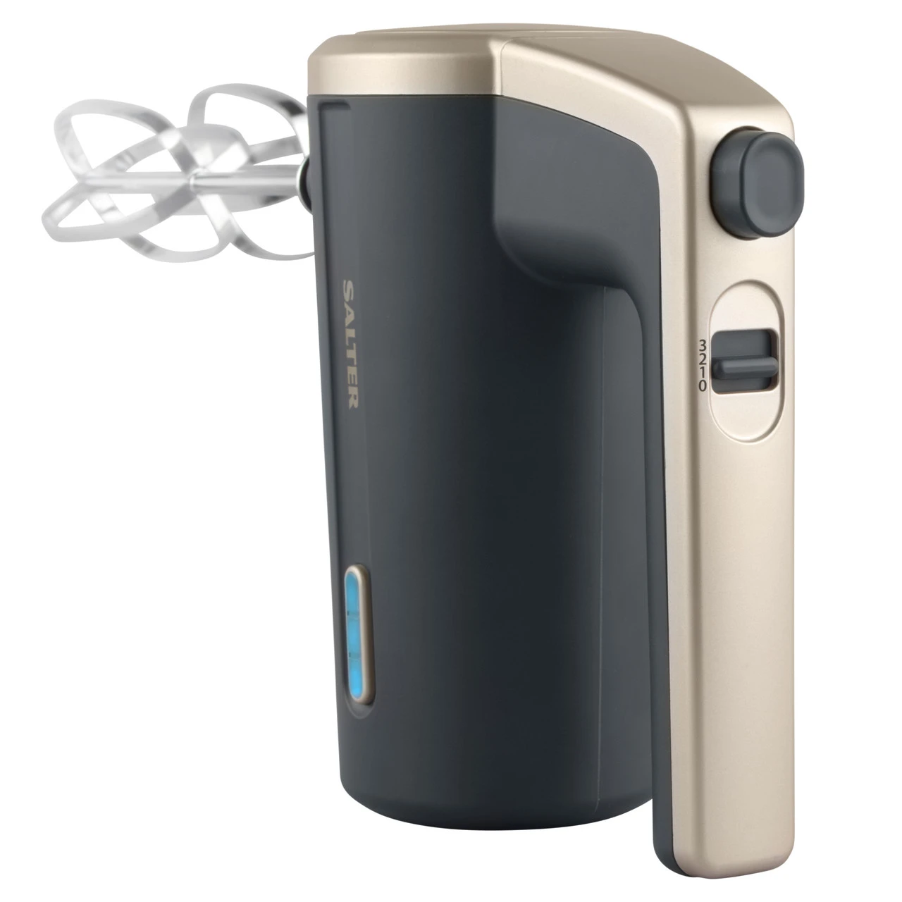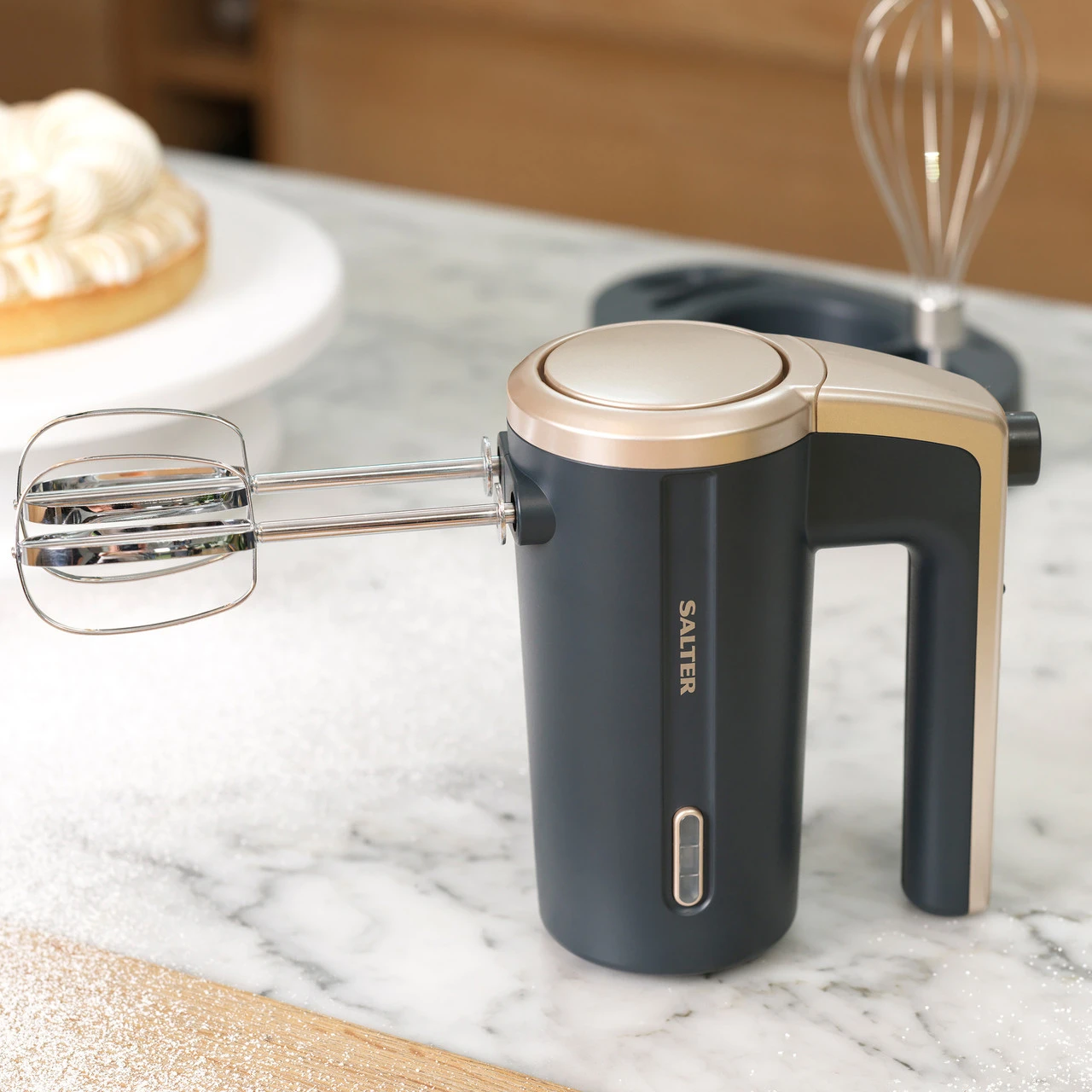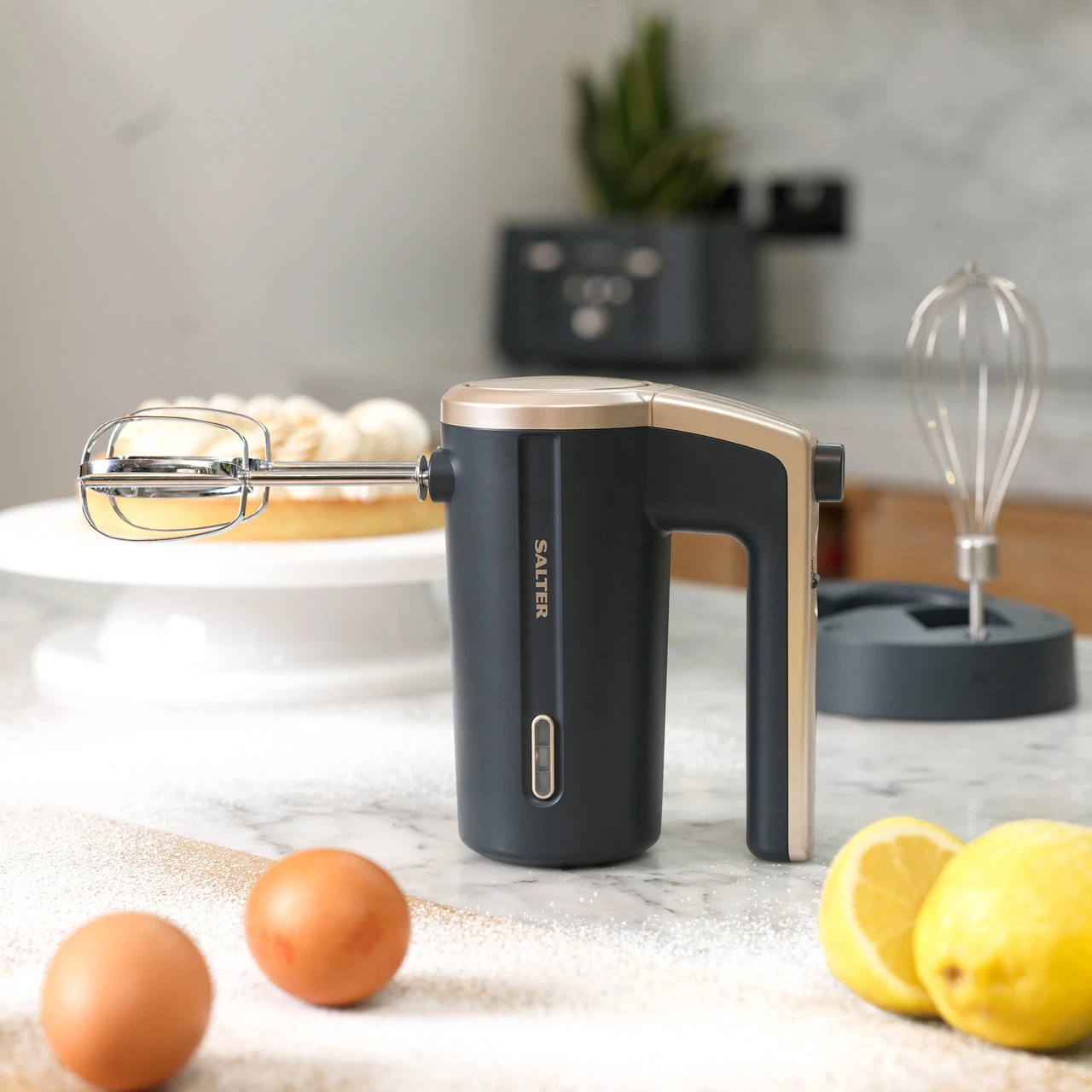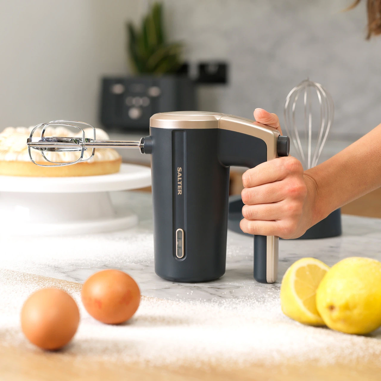 Ditch the cord with the Salter Hand Mixer; the perfect tool for easily mixing cookie batters, cakes and desserts without any cords getting in the way. This hand mixer is equipped with 3 speed settings, letting you adjust the power to suit your needs, and an eject function for quickly changing attachments. Including 2 beaters and a balloon whisk for maximum versatility in the kitchen, the mixer also contains a type C charging cable and adaptor for easy charging on its storage base between uses.