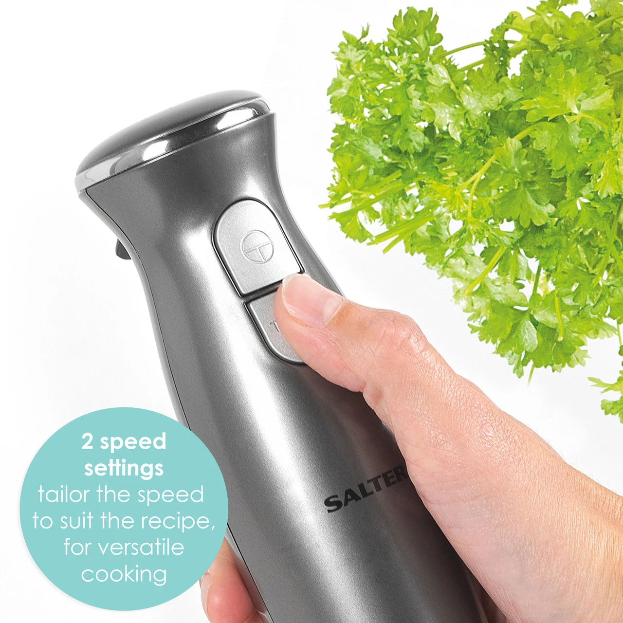 - Lightweight but powerful, this Salter Cosmos Hand Blender is finished in a refined metallic colourway, complimenting any kitchen.