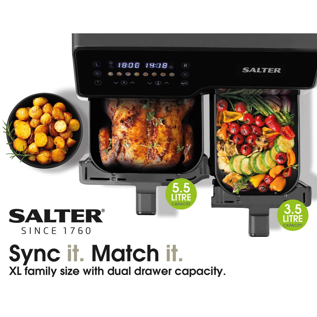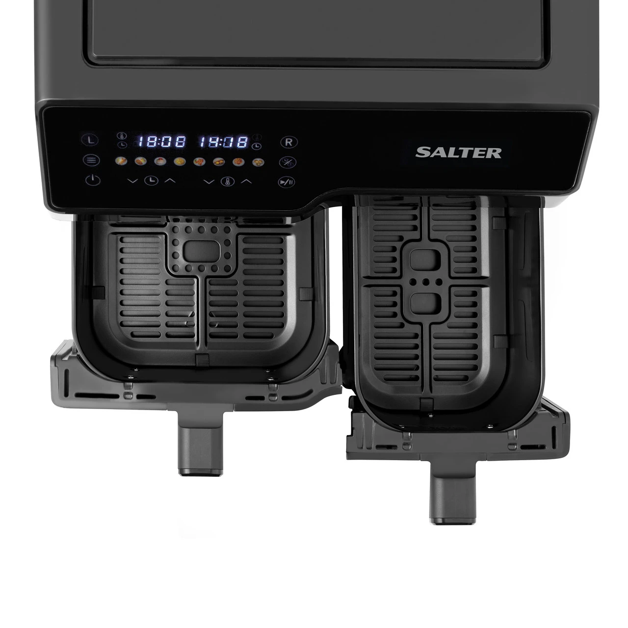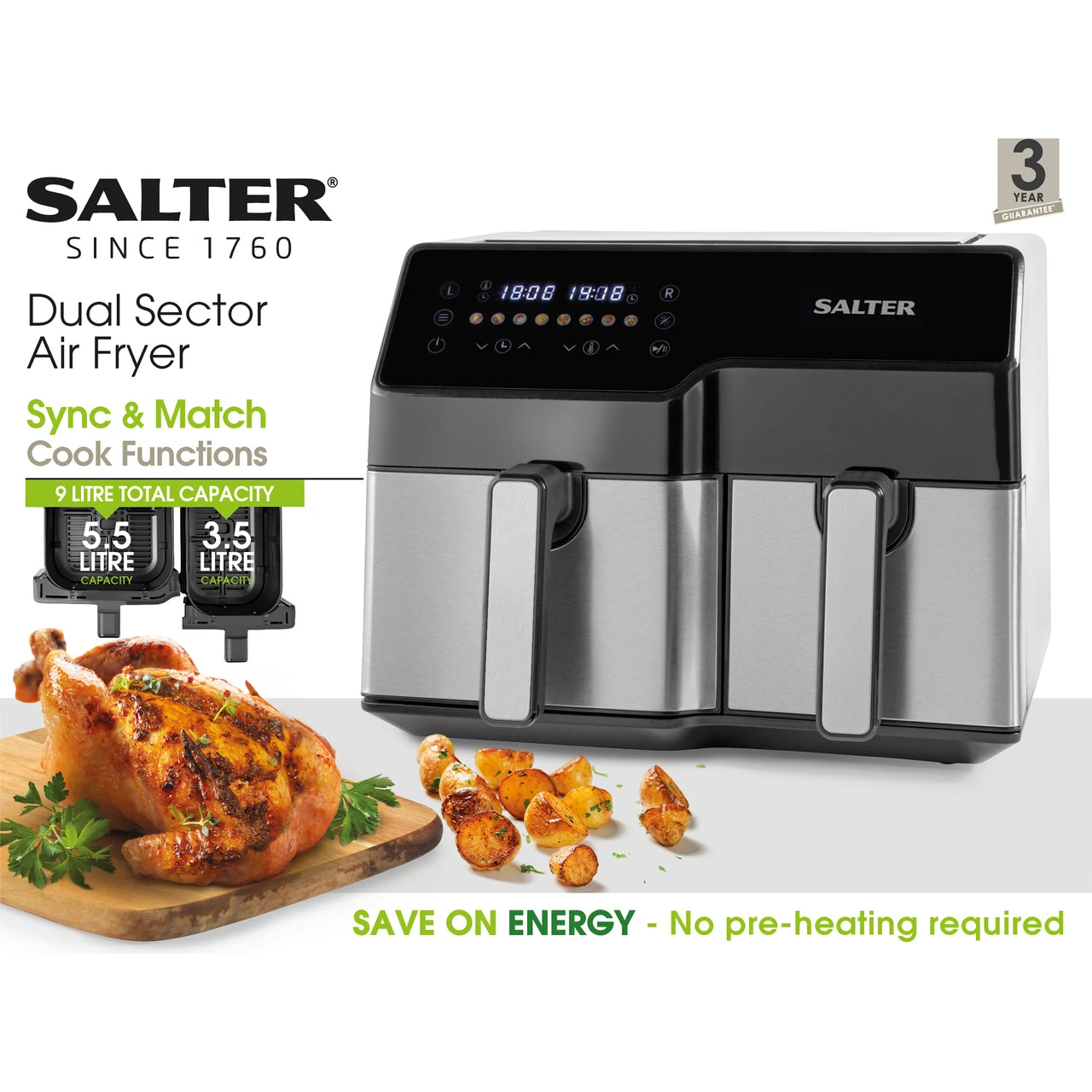 - This Salter Dual Sector Air Fryer has a total capacity of 9L, and requires no pre-heating, helping you save time and energy.