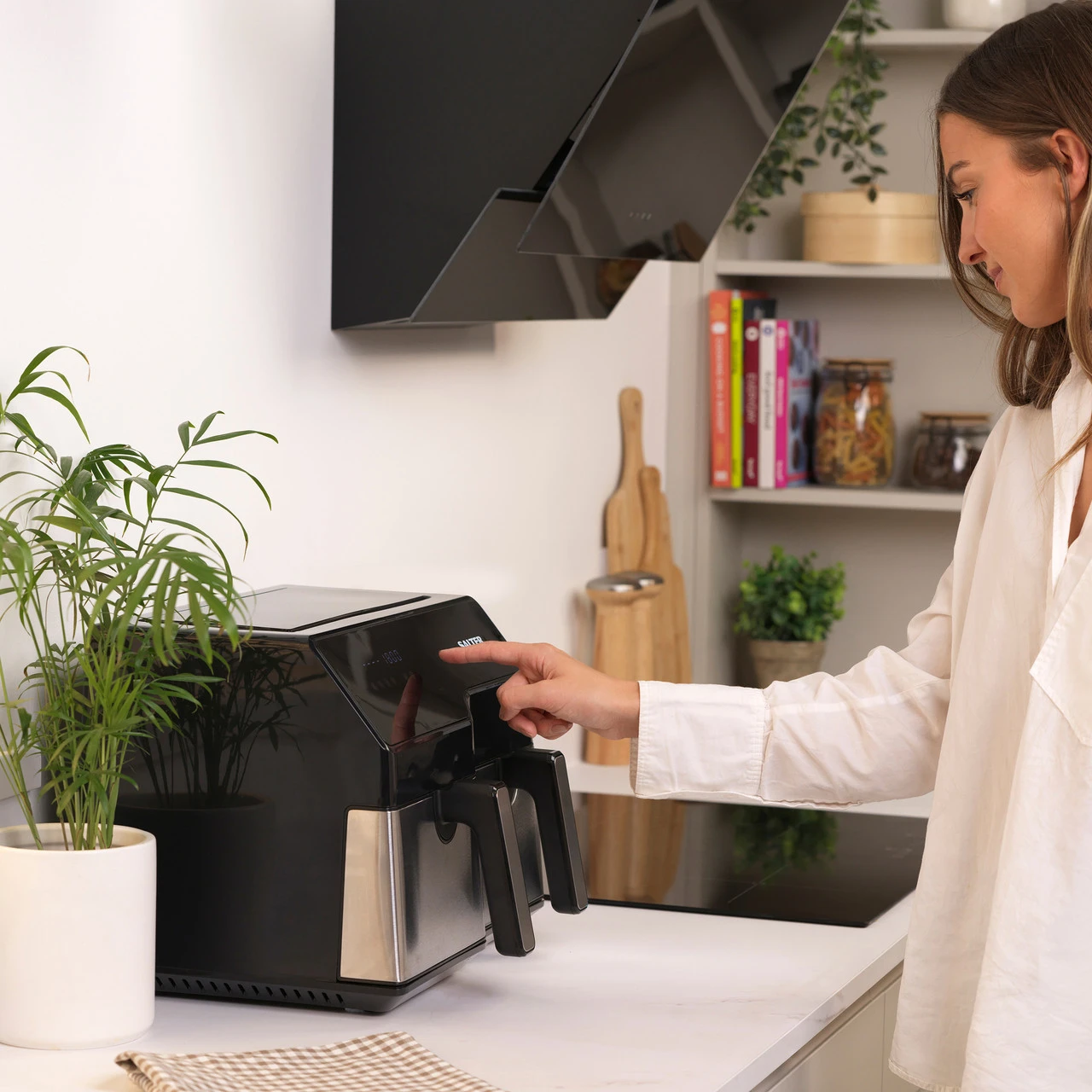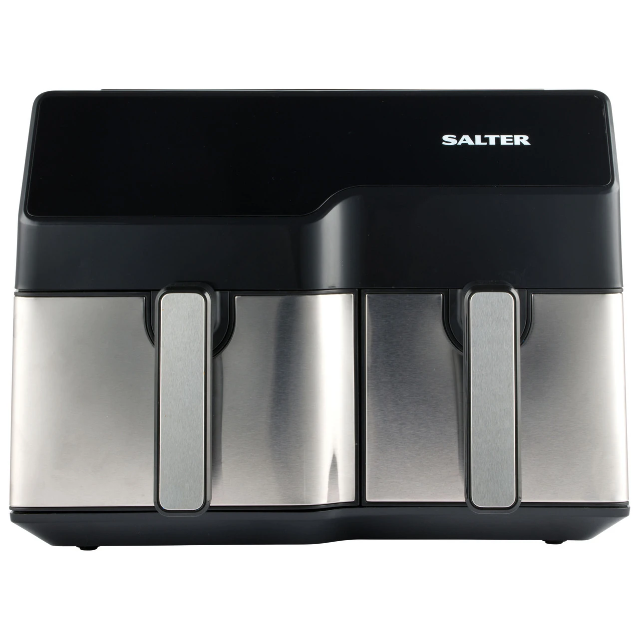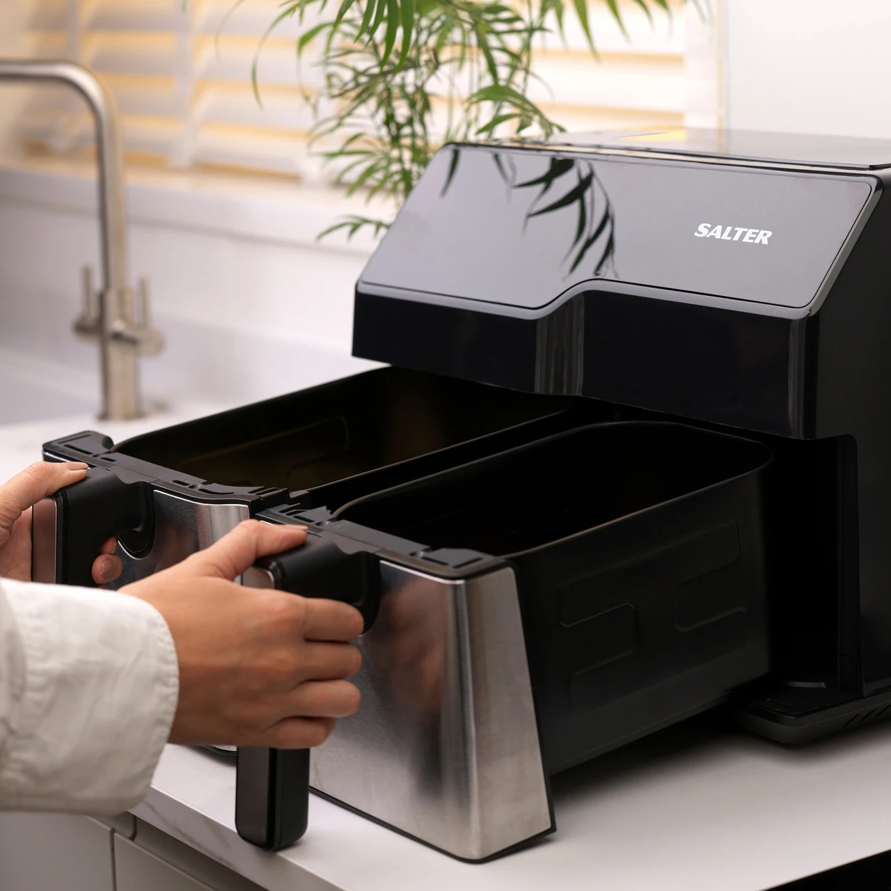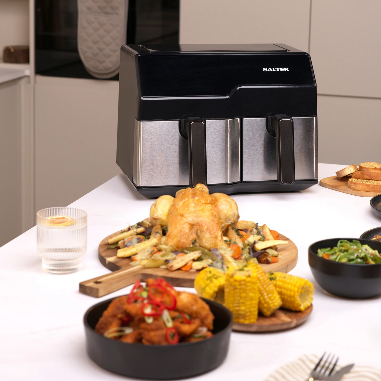 - This Salter Dual Sector Air Fryer has a total capacity of 9L, and requires no pre-heating, helping you save time and energy.
