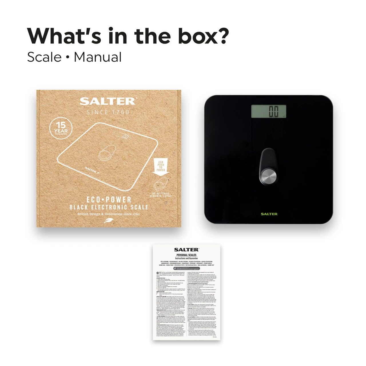- Boasting a large maximum capacity of 180 kg, the Premium Eco Power Electronic Scale from Salter can show results in kg, lbs or stone.