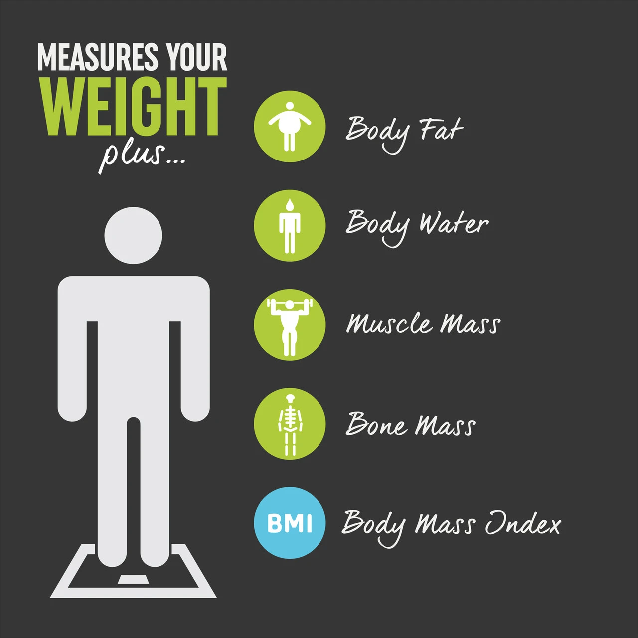 - Monitor your health and fitness with multiple body composition measurements; body fat, body water, muscle mass, bone mass and BMI.