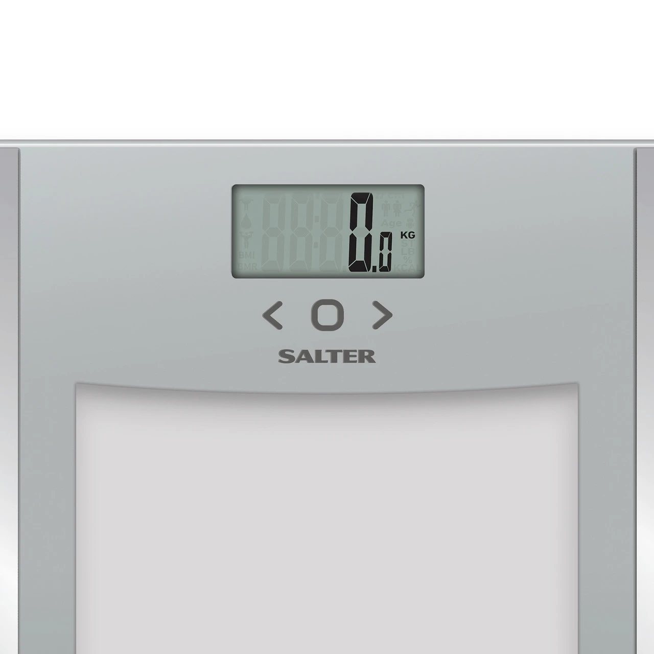 Monitor your health and fitness effortlessly with the impressive Glass Analyser Bathroom Scale from Salter. The versatile bathroom scale measures many aspects of your body composition such as body fat, body water, muscle mass, bone mass and BMI. Including an athlete mode and 8 user memory for the whole family, easily store measurements on the scale to see previous readings. With a maximum capacity of 150 kg, simply step on the scale for instant weight measurements shown on the large LCD display. If the battery compartment does not close securely, stop using the product and keep it away from children. If you think batteries have been swallowed or placed inside any part of the body, seek immediate medical attention.
