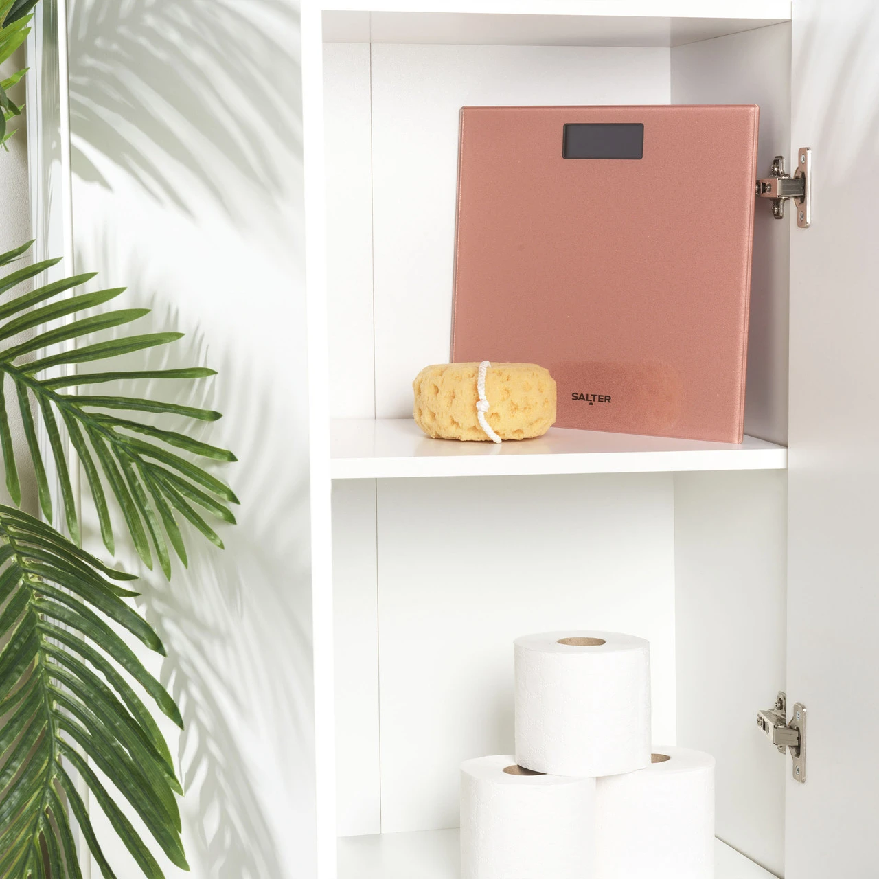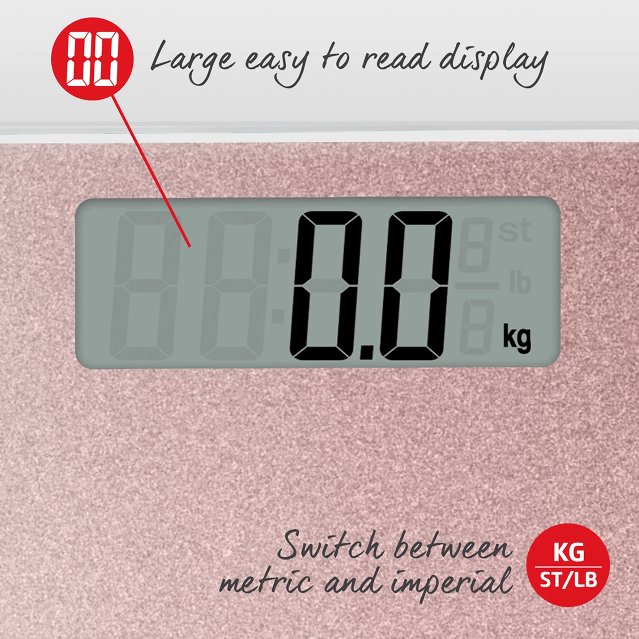 Achieve fuss free weight management at home and add a touch of sparkle to your bathroom with this Salter glass electronic digital scale featuring an elegant silver/rose gold glitter finish. This intelligent digital bathroom scale has a large easy read LCD display and shows instant weight readings in kilograms, stones and pounds. With an ultra slim platform and generous foot room, this sleek scale comes with carpet feet for accurate weighing on uneven floors and a variety of surfaces. If the battery compartment does not close securely, stop using the product and keep it away from children. If you think batteries have been swallowed or placed inside any part of the body, seek immediate medical attention.