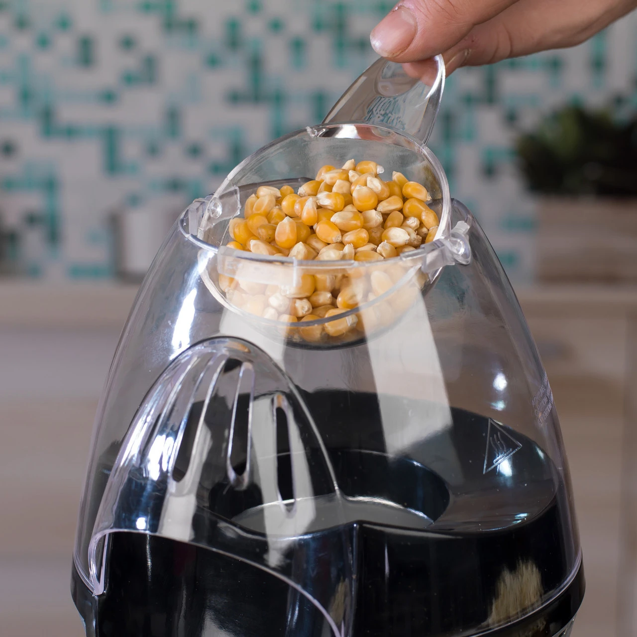 - With 1200W power and an integrated measuring cup, 1 cup of kernels produces a bowl of popcorn, so you can make just the right amount.