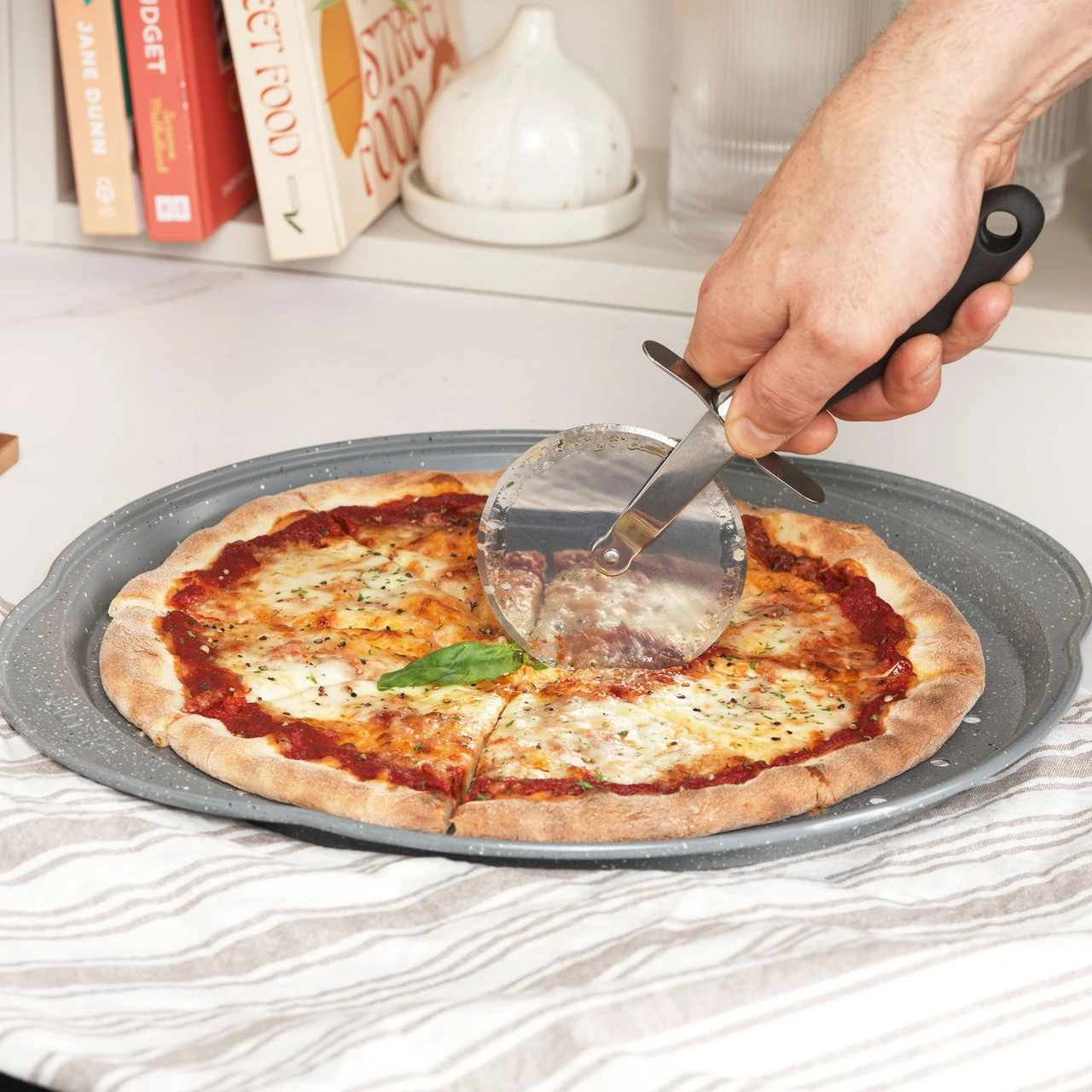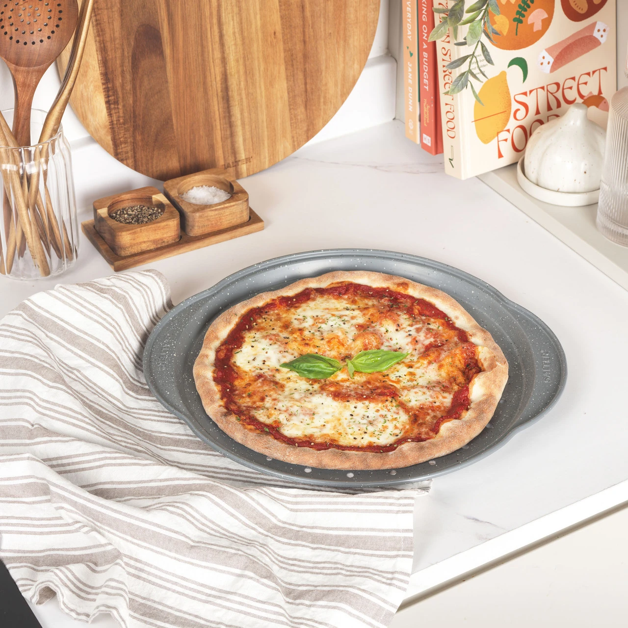 - Offering long-lasting quality, this Salter Marblestone 37 cm pizza tray is perfect for cooking delicious pizza and crispy garlic bread.