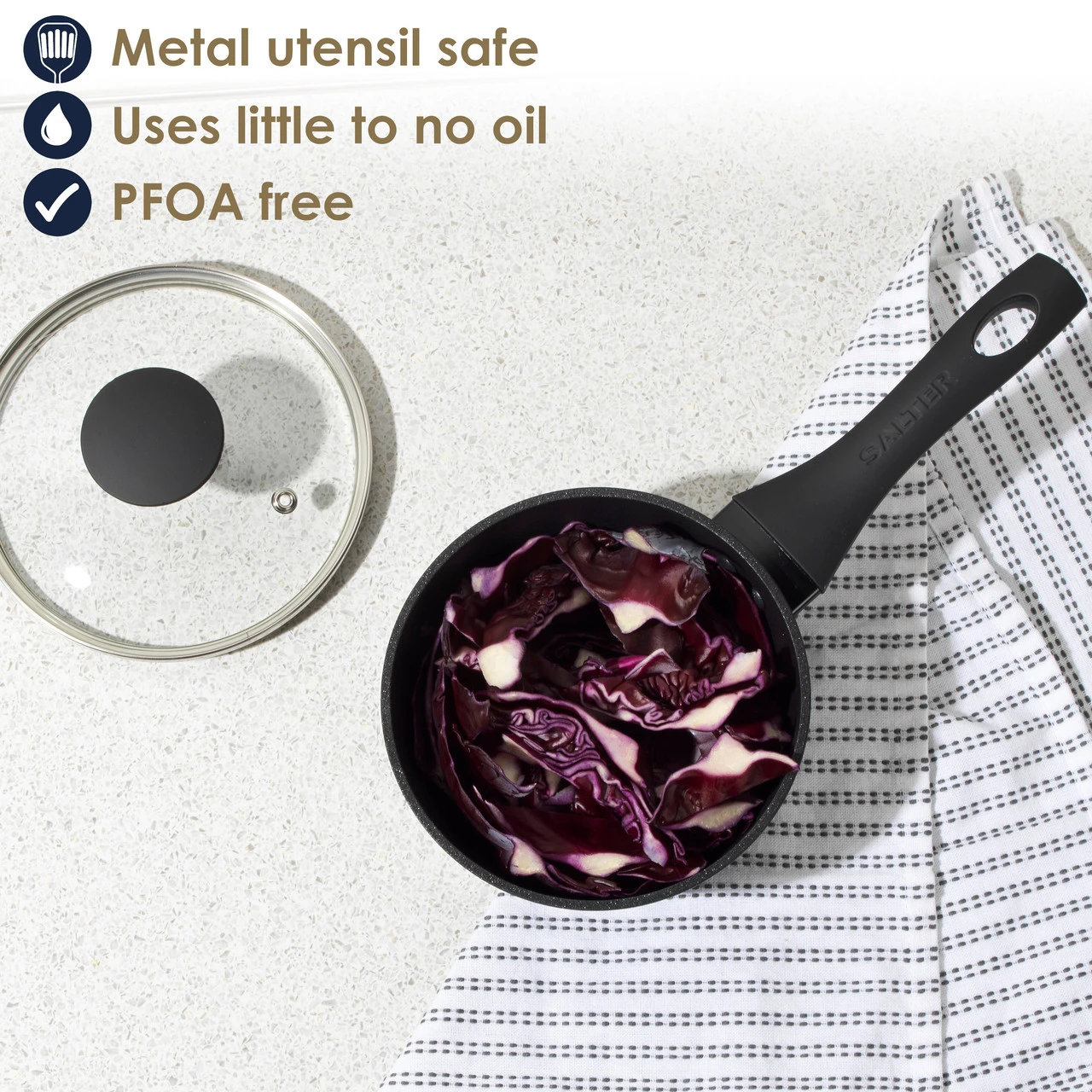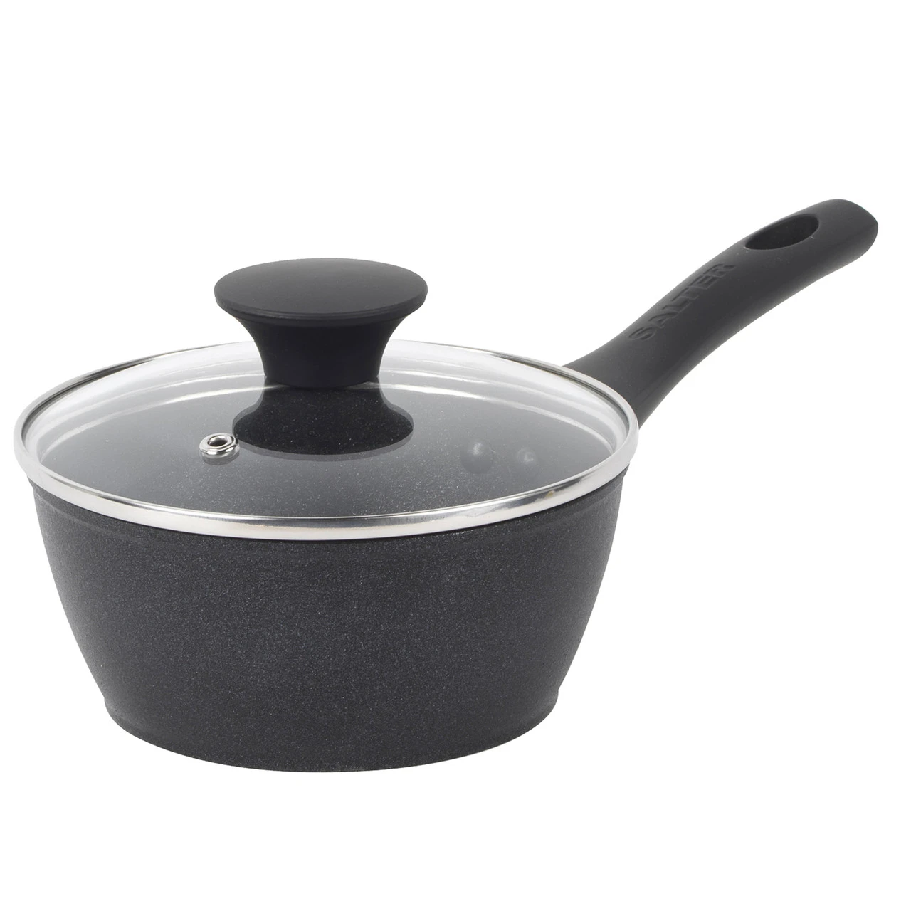 With 260 years of providing excellent goods for everyday homes and a great addition to any collection, this Salter Megastone Noir 16 cm Saucepan is 7 x tougher when tested against a leading homewares retailer own-brand non-stick pan, allowing you to cook using little to no oil. Made with a corrosion-resistant forged aluminium body, this saucepan is 100% PFOA free meaning no harmful chemicals are released when cooking and is suitable for use on all hob types including induction. Wonderfully metal utensil safe, precondition the non-stick surface before first use.
