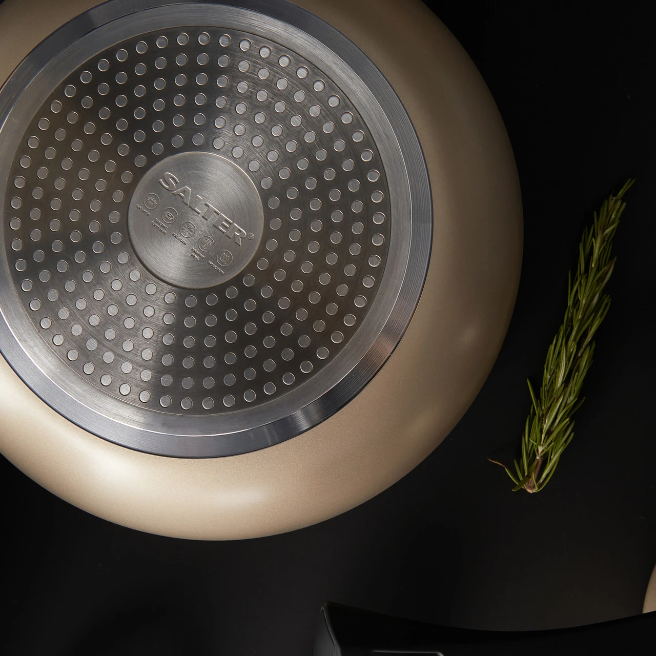 - Boasting high performance non-stick cooking surface, the stylish pan has a gold finish to add a subtle touch of colour to your cookware.